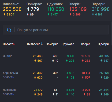 За 8 октября в Украине выявили 5 804 новых заболевших коронавирусной инфекцией COVID-19 (всего с начала пандемии – 250 538 подтвержденных случаев).