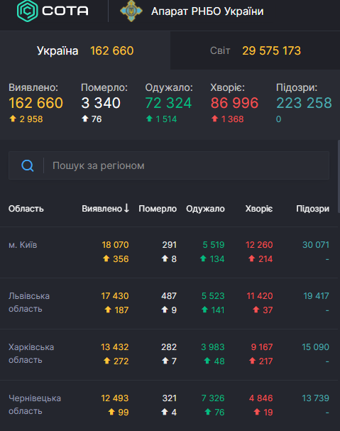 Выздоровело за сутки 1514 человек (всего с начала пандемии – 72 324 человека), а умерли от осложнений 76 пациентов (всего 3340). Количество активных случаев за 24 часа выросло на 1368 и теперь составляет 86 996, сообщается на сайте СНБО.