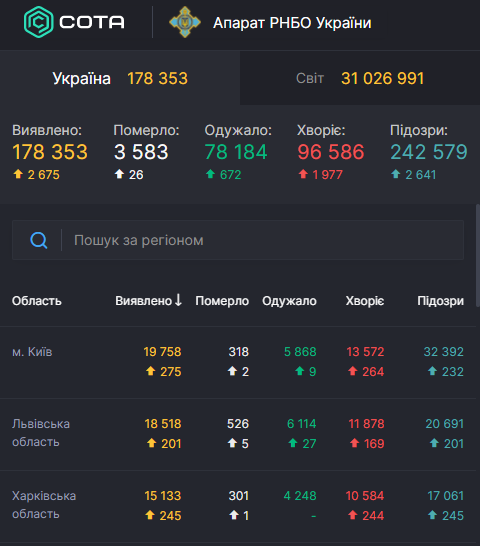 За 20 сентября в Украине подтвердили 2 675 новых случаев COVID-19. Общее количество подтвержденных случаев достигло 178 353 человека.