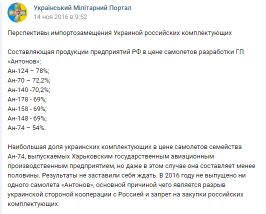 Украинские самолёты состояли из российских комплектующих на 50-70%. Часть комплектующих уникальна, то есть замены на мировом рынке нет. Создание на своих предприятиях аналогов российских деталей требует технического перевооружения, а на это нет денег.