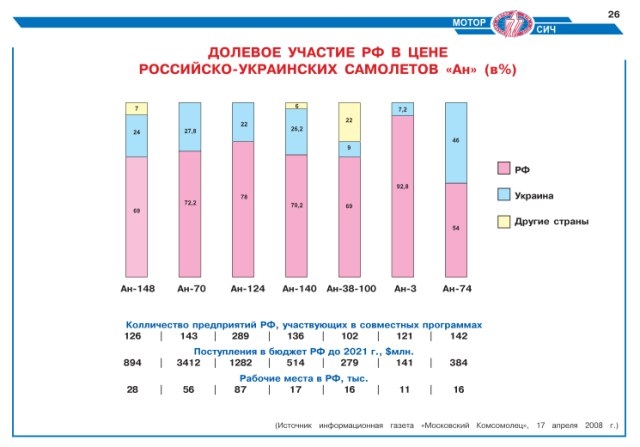 Плюс есть проблемы с интеллектуальными правами. Финансированием постройки новых гражданских самолётов занималась российская лизинговая компания. Часть работников сманили обещанием высокой зарплаты в Воронеж. Толковые молодые конструкторы уезжают в Европу и Америку работать на Airbus и Boeing. Это если говорить о киевском заводе Антонова. В Харькове всё ещё хуже. Долг по зарплате 150 миллионов гривен, больше девяти месяцев на заводе не было централизованной подачи света и воды. Завод занимается обслуживанием ранее выпущенных самолетов, то есть работают только два цеха из всего завода. Ну и заказ на гусеницы для БМП получил ещё.