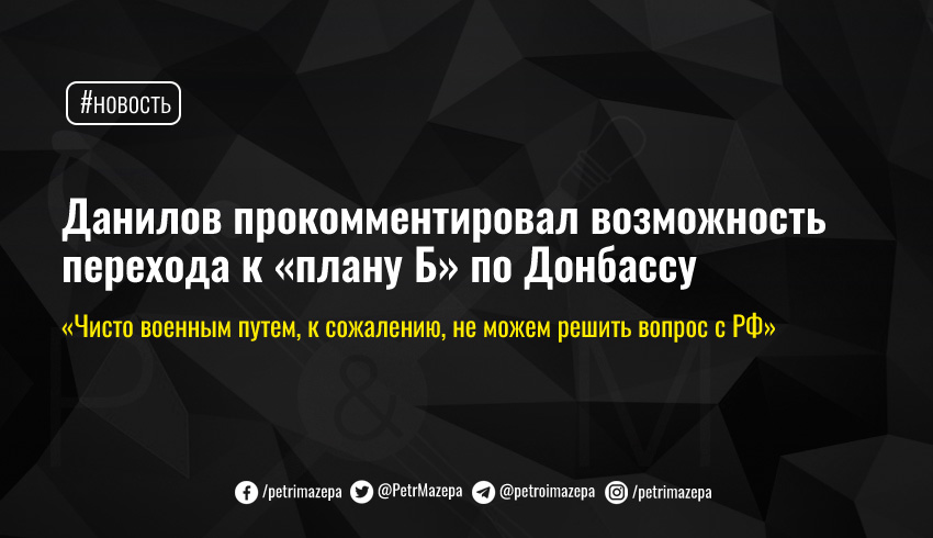 Секретарь СНБО Алексей Данилов, рассказывая о возможности перехода к «плану Б» по Донбассу, отметил, что Украина будет отталкиваться от развития событий в регионе, и подметил, что «к сожалению, чисто военным путем мы не можем решить вопрос с Российской Федерацией».