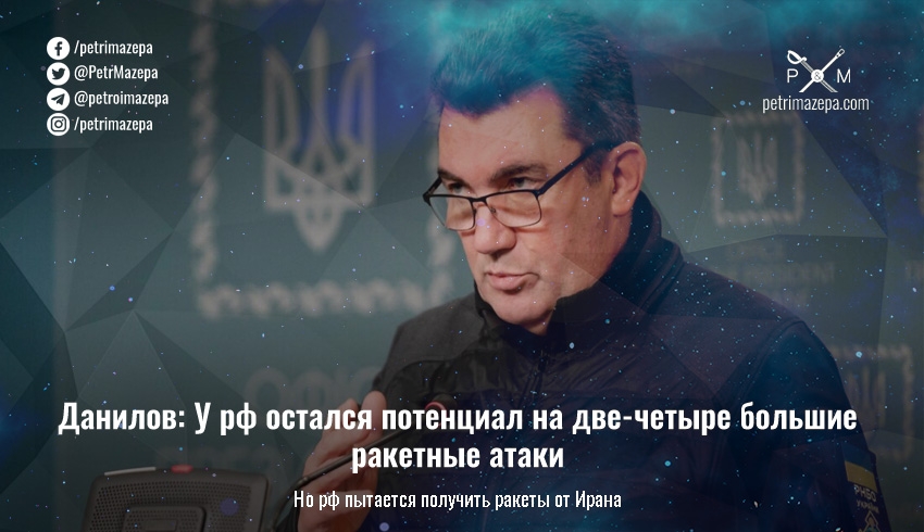Секретарь СНБО Алексей Данилов считает, что у россии осталось потенциала на две-четыре большие ракетные атаки. Однако рф пытается получить ракеты от Ирана, у нее остаются ракеты С-300, которыми она бьет по прифронтовым городам, и иранские дроны-камикадзе.