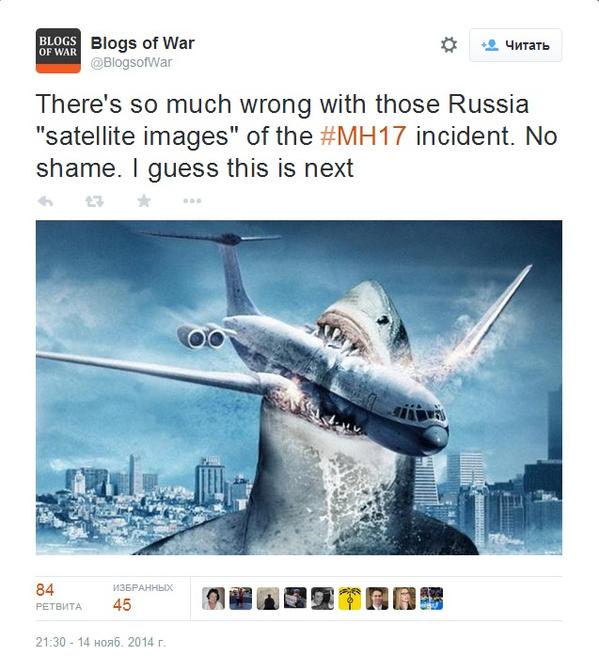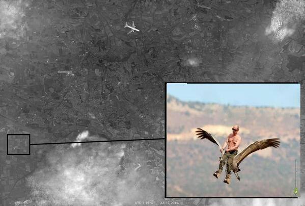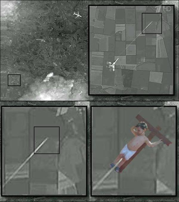 На абсолютно серьезных щщах показали отфтошопленную склейку из гугло-карт, уже месяц активно гуляющую по сети, сообщив, что на ней запечатлен именно момент выстрела какого-то истребителя бластером по «Боингу». Еще и посоветовали Владимиру Путину дерзко предоставить это фото австралийскому премьеру.