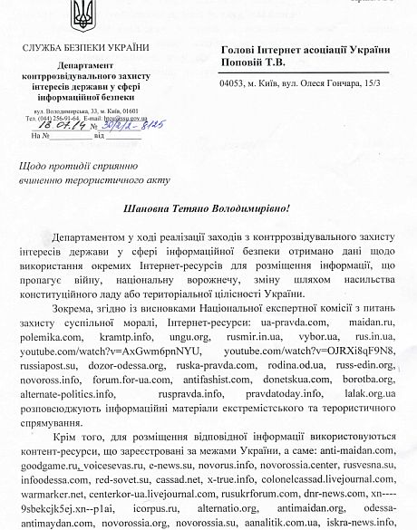 Служба безопасности Украины попросила Интернет ассоциацию Украины заблокировать сайты, распространяющие информацию, которая "пропагандирует войну, национальную вражду, изменение путем насилия конституционного строя или территориальной целостности Украины".