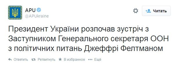 Президент Украины Петр Порошенко встретился с заместителем Генерального секретаря ООН по политическим вопросам Джеффри Фелтманом.