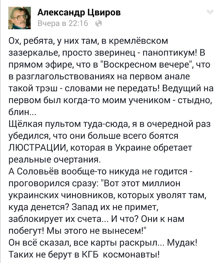 Но и на этом Петр Алексеевич не остановился. И сказал, что одними военными методами победить невозможно, и намекнул, что СБУ начало работать «более лучше». Весь костяк «Оплота», регулярно ездящий на побывку из Донецка в родной Харьков, передает сотрудникам СБУ пламенный привет.
