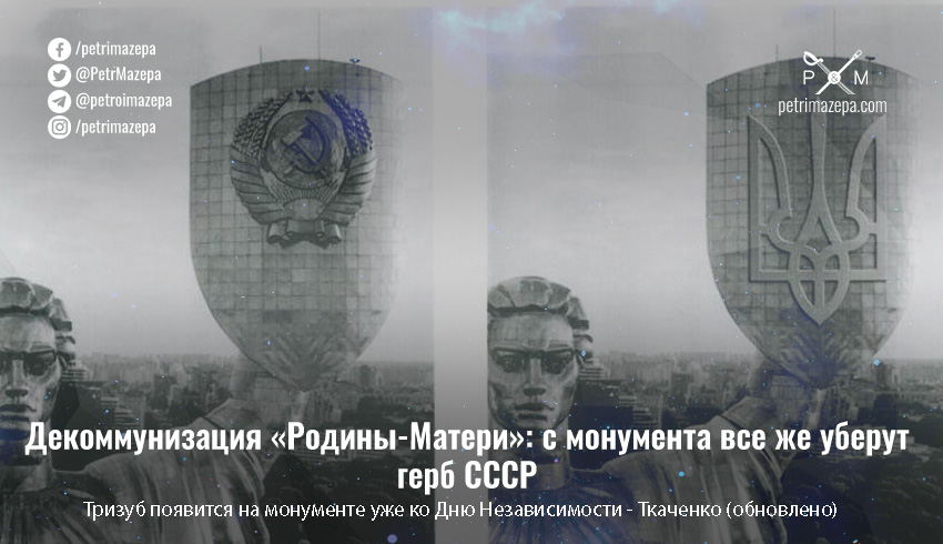 «Проектными решениями предусматривается устройство Тризуба на щите монумента, который соответствует изображению на малом Государственном Гербе Украины. Тризуб заменит старый советский герб», — сообщает Министерство развития громад, территорий и инфраструктуры Украины. Правда, там не называют никаких сроков завершения работ или хотя бы их начала — «ожидается, что работы стартуют в ближайшем будущем».