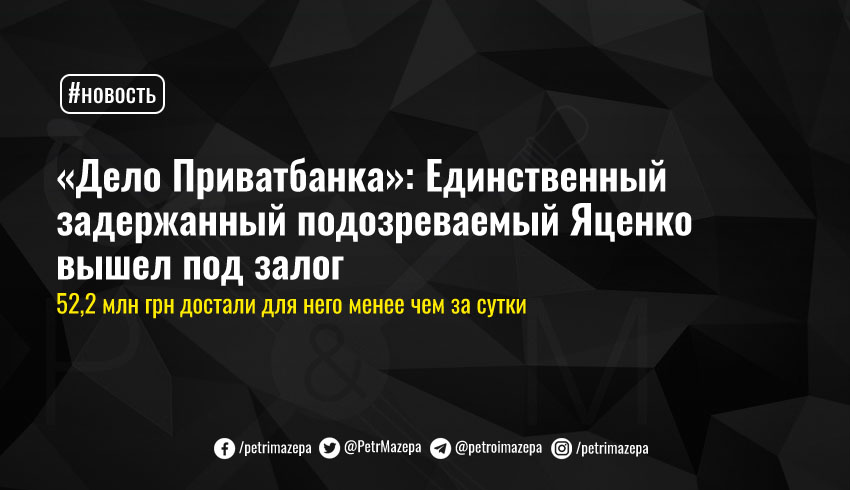 «За экс-заместителя главы крупного банка, которому накануне была избрана мера пресечения - содержание под стражей с альтернативой внесения залога - внесли средства. Залог внесен в полном объеме, как это определено в постановлении, то есть 52 млн 210 тыс грн» - цитирует «УП» спикера ВАКС Олесю Чемерис.