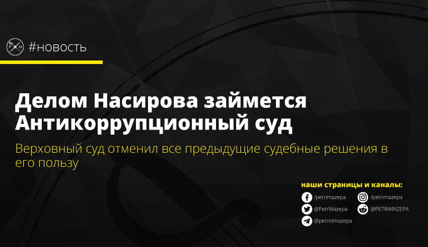 Верховный суд отправил дело экс-главы Государственной фискальной службы Романа Насирова на рассмотрение в Антикоррупционный суд. Суд отменил решения судов предыдущих инстанций, которые, рассматривая дела о злоупотреблении Насировым властью, решили, что он выполнял лишь «церемониальные функции», подписывая документы о рассрочке платежей для компаний беглого нардепа Онищенко.