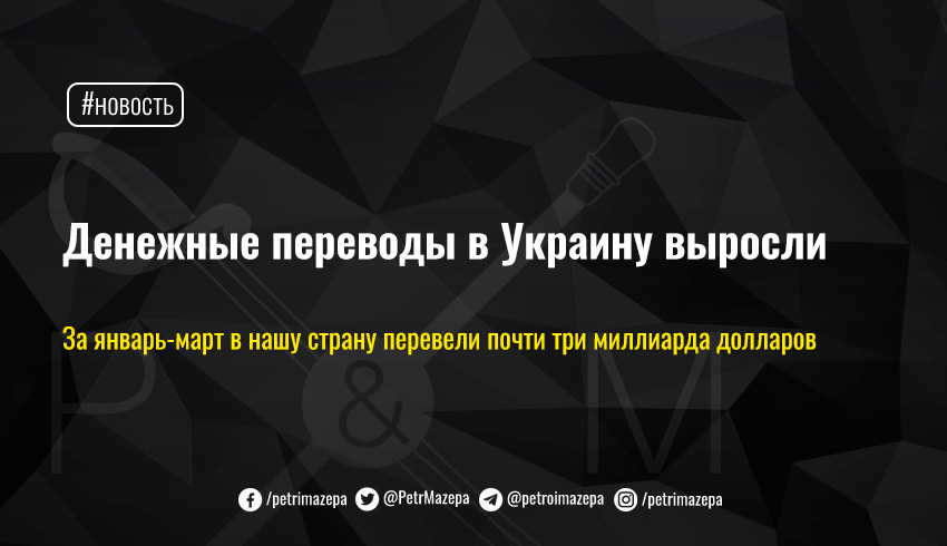 Как сообщает НБУ, всего за январь-март в Украину поступило 2,9 млрд долларов, что на 1,1% больше, чем годом ранее (2,87 млрд долларов).