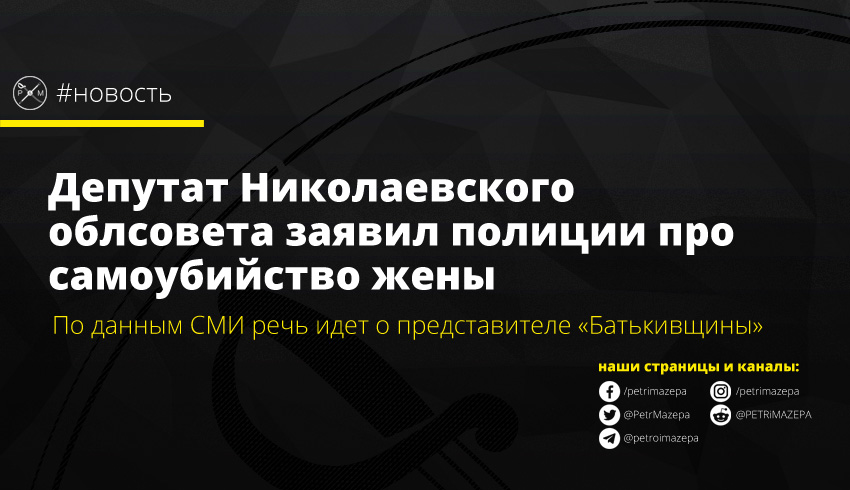 Сегодня в первой половине дня правоохранителям Николаевской области поступило сообщение от 34-летнего депутата облсовета о том, что его жена совершила самоубийство.