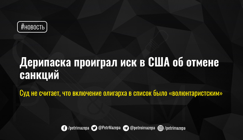 Суд отказал российскому бизнесмену Олегу Дерипаске в иске с требованием отменить введенные против него санкции Минфина США. Суд отверг доводы защиты о том, что включение в санкционный список было волюнтаристским, и не согласился, что права Дерипаски в ходе рассмотрения дела были нарушены.