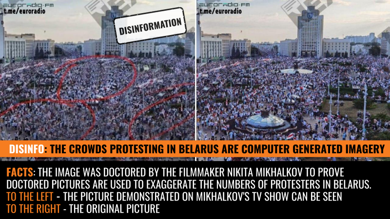 Режиссёр и лауреат «Оскара» Никита Михалков захотел показать, что изображения массовых демонстраций против Александра Лукашенко в Беларуси — это лишь подделка, нарисованная с помощью компьютера. Итак, в его телешоу некоторые изображения подделали самих себя и транслировали их как доказательство подделки.