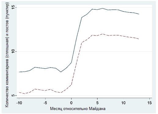 Согласно нашим данным, наблюдается отчётливый экспоненциальный рост активности пользователей после начала протестов на Майдане в ноябре 2013 года и после начала военного конфликта. В частности, среднее количество комментариев к политическим постам возросло с примерно тысячи в месяц в начале 2013 года до нескольких миллионов в 2014 году.