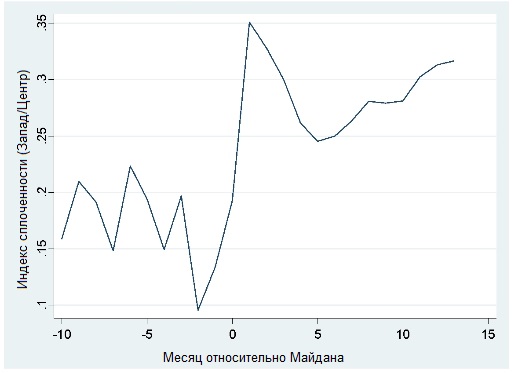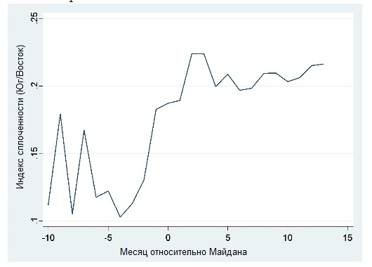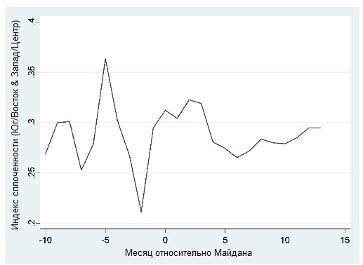 Картина меняется, если мы обратимся к общению между областями, расположенными на юго-востоке страны, и Западной и Центральной Украиной. Здесь мы видим, что до Майдана большинство обсуждений в интернете были односторонними и велись между представителями одного региона. Этот результат совпадает с результатами недавнего исследования, осуществлённого Диниссой Дувановой, Александром Семеновым и Александром Николаевым, которые установили, что большинство коммуникаций, как правило, происходит внутри западной и восточной частей страны, а не между ними. Коренное отличие в том, что ситуация не изменилась после начала войны: как можно видеть на диаграмме, после начала конфликта динамика показателя сплочённости не возросла.