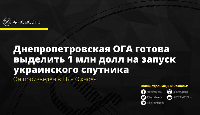 Днепропетровская ОГА готова выделить из областного бюджета 1 миллион долларов на софинансирование запуска украинского спутника, который был произведен в КБ «Южное» в Днепре. Общая стоимость запуска составляет 8-10 миллионов долларов.
