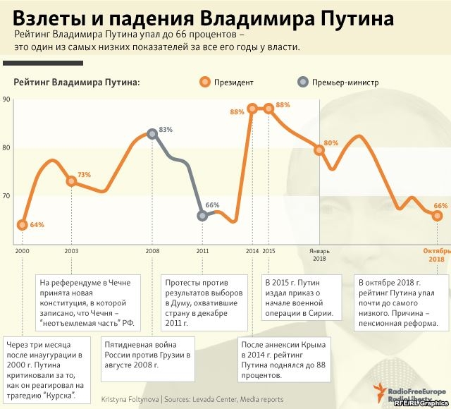 — Нет, он не находится у критической черты просто потому, что в запасе ещё достаточное, с одной стороны, количество денег, чтобы поправить ситуацию с этим фиаско с точки зрения пиара, я имею в виду пенсионную реформу, — говорит Леон Арон. — А с другой стороны, всегда в запасе репрессии, невозможность для какой-либо серьёзной оппозиции выйти напрямую к людям. Поэтому я считаю, что кризиса нет. После 2012 года ставка сделана на патриотическую мобилизацию, а не на рост доходов. Это действовало. Вопрос в том, насколько эта ставка будет продолжать быть эффективной, насколько патриотическая мобилизация сможет перевешивать недовольство подобными экономическими моментами в стране.