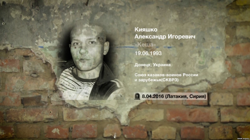 Третій — Кияшко Олександр Ігорович, позивний Кеша, 23 роки, Донецьк, Україна. Воював на Донбасі у складі угруповань «ЛНР» і «ДНР». Загинув біля сирійського міста Латакія 8 квітня 2016 року.