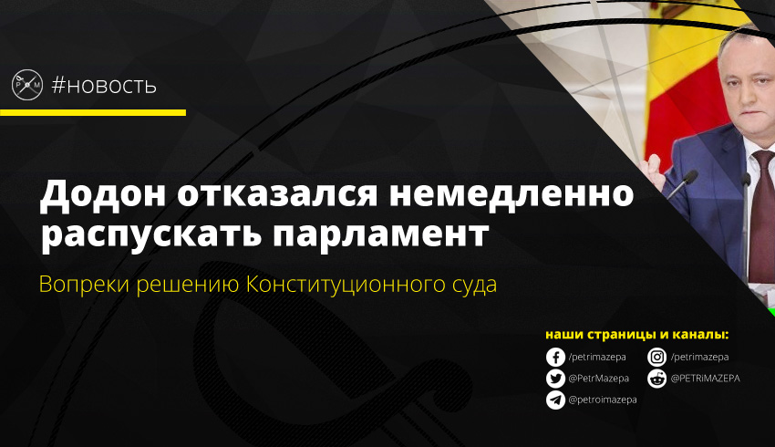 - Конституционный суд Молдовы обязал Додона 10 июня распустить парламент и назначить дату досрочных выборов. Решение КС последовало через несколько минут после того, как президент Игорь Додон заявил, что правящую коалицию и новое правительство в стране создать не удалось. Он обещал ещё раз обратиться в КС, чтобы утвердить решение о роспуске парламента.
