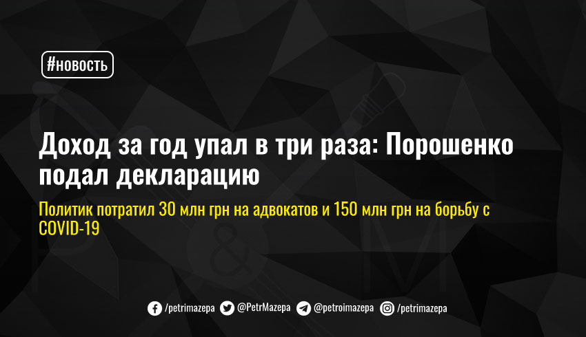 Пятый президент Украины, нардеп от «ЕС» Петр Порошенко подал электронную декларацию – согласно ее данным, в прошлом году он заработал в три раза меньше, чем в 2019 году, а из 79 млн грн трат около 30 млн грн ему пришлось потратить на адвокатов для защиты по более чем 50 уголовным делам.