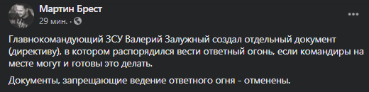 Также, по данным Бреста, Залужный «создал отдельный документ (директиву), в котором распорядился вести ответный огонь, если командиры на месте могут и готовы это делать».
