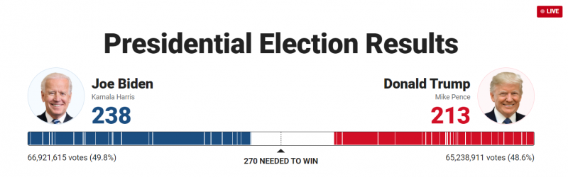Согласно последним данным Джо Байден получает 238 голосов, а Дональд Трамп – 213.