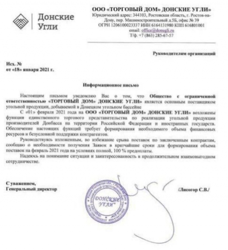 Сообщения об утрате монопольного контроля над вывозом угля появились ещё в декабре 2019-го, но тогда это был фальстарт. Только ближе к концу 2020-го угольные схемы начали изменяться. Первое реальное подтверждение тому появилось в анонимном Телеграм-канале ВЧК-ОГПУ, где было опубликовано фото письма генерального директора, в котором он уведомил предприятия углепрома о том, что правила меняются. Отныне поставки угля из #ордло в РФ ведутся в основном через недавно созданное ООО Донские угли, за которым стоит одиозный Медведчук.