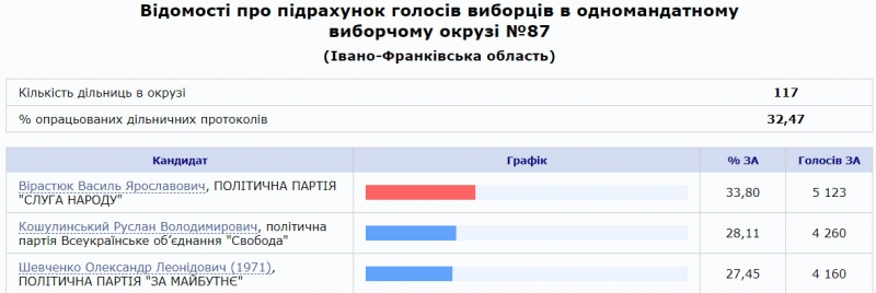 Основная интрига сегодня в Ивано-Франковской области. Тут по состоянию на 10 утра обработано 32,47% протоколов. И с отрывом менее чем в тысячу голосов лидирует кандидат от монобольшинства Василий Вирастюк. На втором месте – Руслан Кошулинский от «Свободы», а на третьем – Александр Шевченко из «За майбутнє».