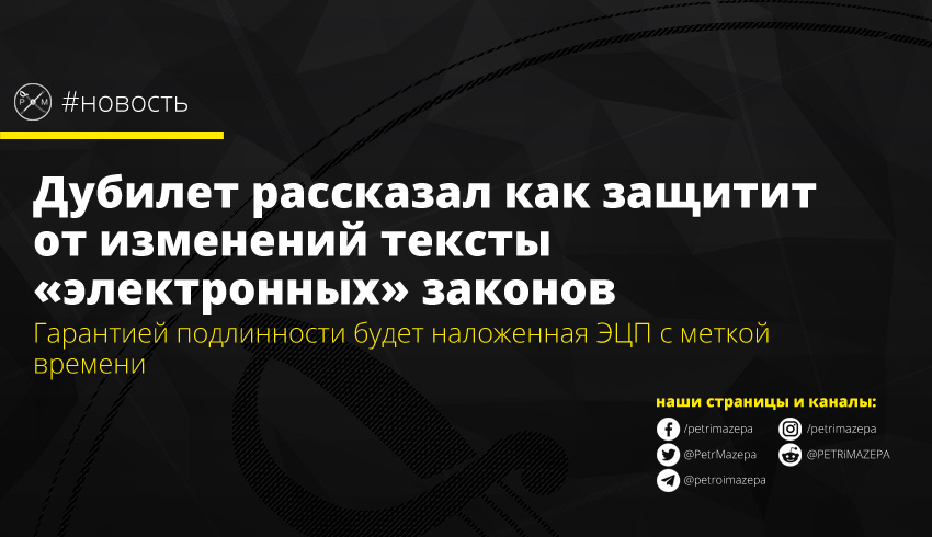 Министр Кабмина Дмитрий Дубилет отреагировал на информацию о том, что тексты «электронных» законов могут подменять или публиковать задним числом. По его словам, нет причин для волнения, поскольку в случае, если обязательная публикация законов в официальной прессе будет отменена, документы будут обнародовать на Едином веб-портале органов исполнительной власти с наложенной электронно-цифровой подписью (ЭЦП) с меткой времени.
