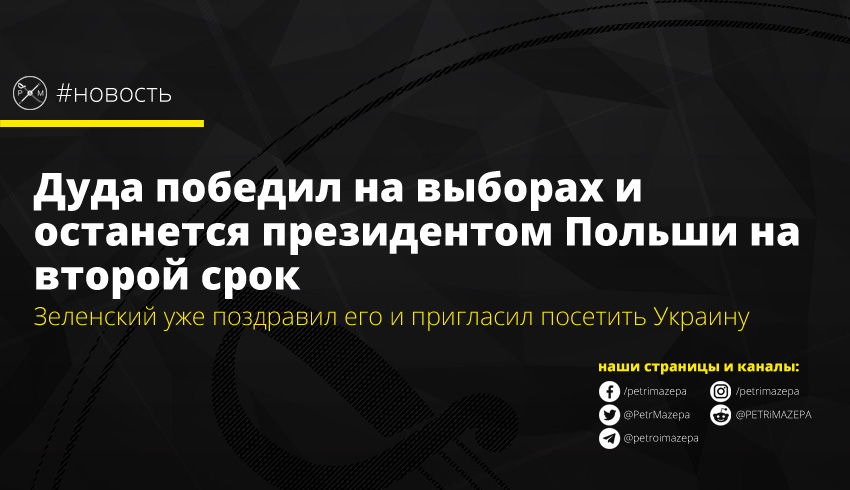 Президент Украины Владимир Зеленский уже поздравил Анджея Дуду с победой на президентских выборах и пригласил посетить Украину. «Искренне поздравляю господина президента Анджея Дуду с победой на выборах! Желаю Польше под Вашим руководством дальнейших успехов и процветания. Приглашаю Вас посетить Украину с визитом для продолжения нашего плодотворного сотрудничества. Вместе мы сильнее!» - написал Зеленский в Twitter.