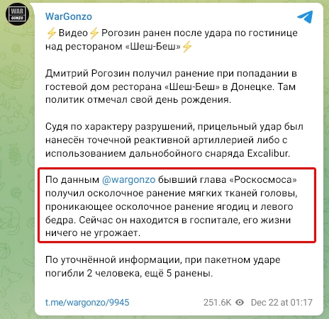 Уже к утру Рогозин оказался более конкретен. «У меня ранение, металлический осколок размером 3×4 мм вошел выше правой лопатки. Предстоит операция. Пострадали ещё несколько близких мне людей», - написал он в Telegram. И каким-то образом определил, что обстрел был или из 120-мм или из 155-мм орудия.