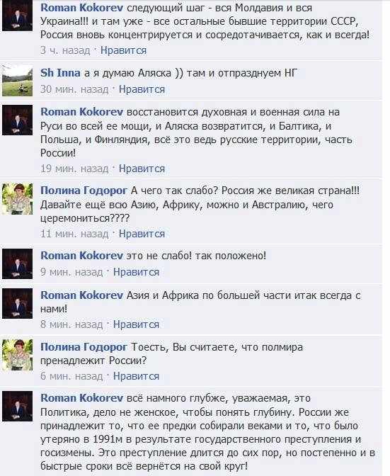 Сегодня мы столкнулись с тем, что война переходит в затяжную фазу. Надежды на то, что Путин успокоится и ограничится Крымом, тщетны. Не успокаивайте себя, не прячьте голову в песок. Война идет, и она надолго. Как сообщил в личной переписке Представитель РФ в Совете Европы Роман Кокорев, в состав России вернется территория Молдавии, Украины, остальных республик бывшего СССР, а также Аляски, стран Балтии, Финляндии и Польши. Размах претензий восхищает. Но я не вижу причин не верить Роману Кокореву.