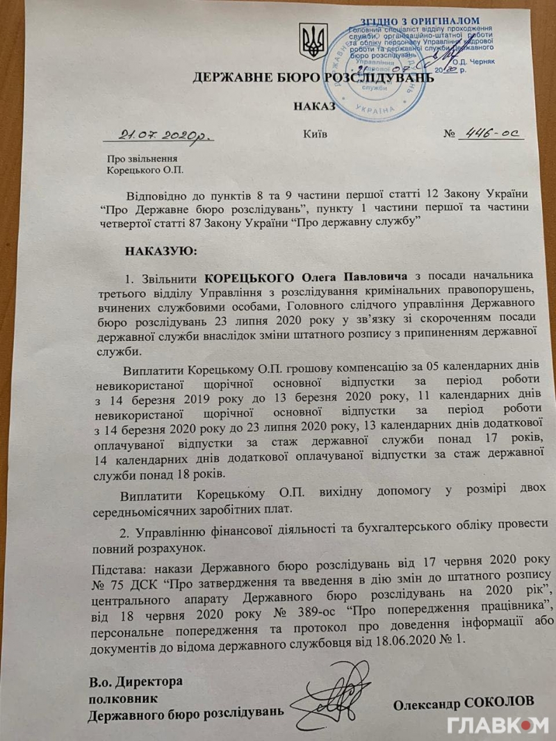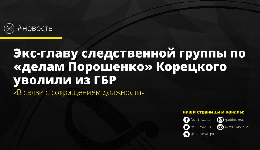 Следователя Олега Корецкого, бывшего главой следственной группы по «делам Порошенко», уволили из Государственного бюро расследований. Об этом он сам сообщил изданию «Главком», показав и документ. Согласно тексту обнародованного приказа и.о. главы ГБР Александра Соколова, уволен Корецкий «в связи с сокращением должности» вследствие изменения штатного расписания.
