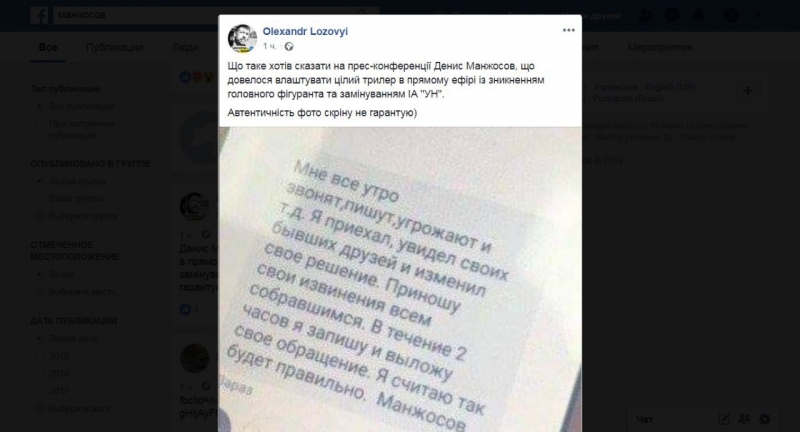 Вскоре после его исчезновения журналисты УП опубликовали скрин СМС, на котором Манжосов обещает в течение пары часов записать ролик, в котором расскажет о причинах своего исчезновения.
