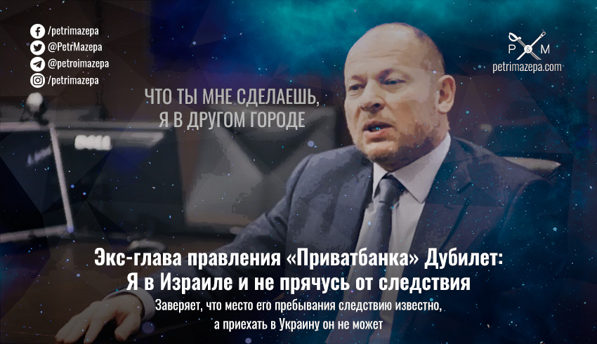 Экс-глава правления «Приватбанка» Александр Дубилет заявил, что находится в Израиле и не прячется от следствия. По его словам, его местонахождение известно НАБУ и САП, в Израиль он выехал задолго до вручения подозрения, и не может приехать в Украину из-за коронавирусных ограничений и войны.