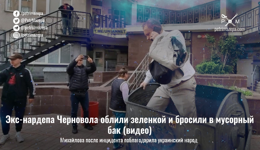Сторонники Михайловой облили неизвестной жидкостью из бутылки, зеленкой и бросили в мусорник бывшего народного депутата Тараса Черновола за то, «что он назвал Михайлову “подолигархической ш*арой”», сообщает УНИАН.