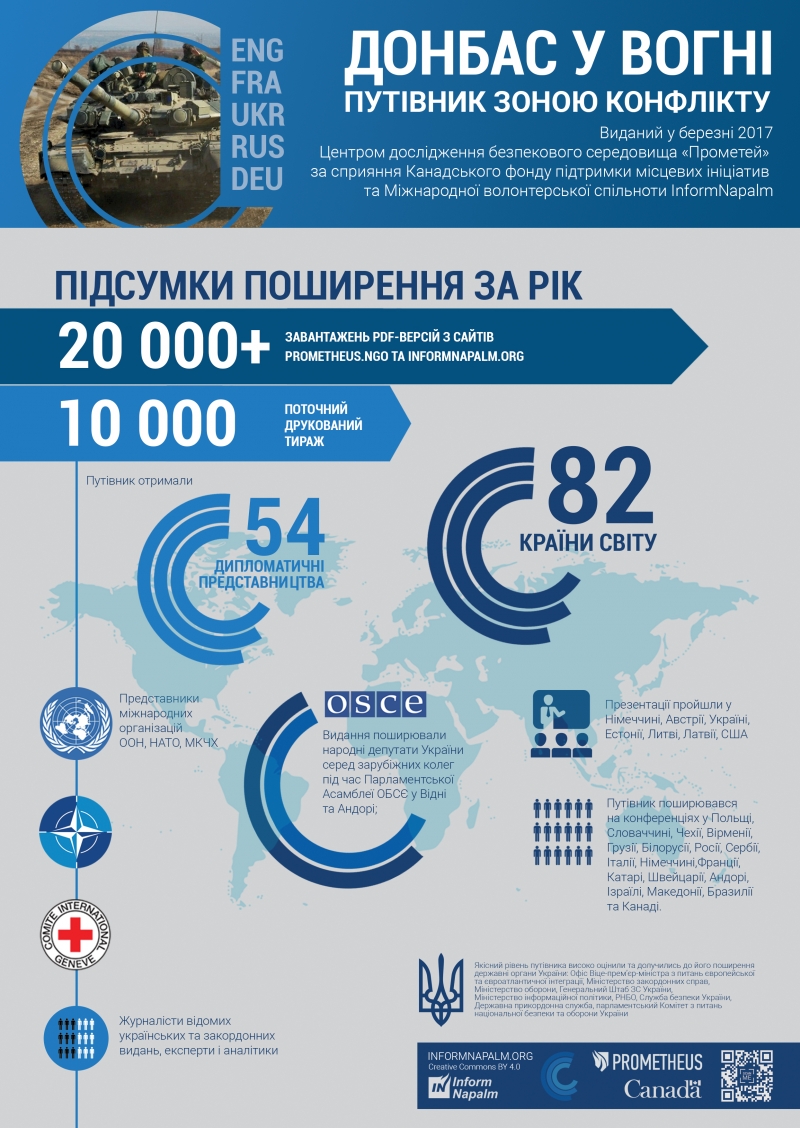 У березні 2018-го минув рік із часу завершення унікального проекту з підготовки та видання комплексного путівника для журналістів і членів спостережних місій у зоні конфлікту на Донбасі. 2017 року експерти Центру дослідження безпекового середовища «Прометей» спільно з дослідниками та перекладачами міжнародної волонтерської спільноти InformNapalm та за фінансового сприяння Канадського фонду підтримки місцевих ініціатив (CFLI) підготували друковане інформаційне видання «Донбас в огні. Путівник зоною конфлікту».