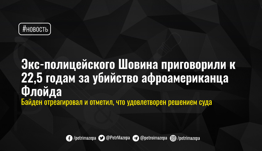 Суд принял решение по делу об убийстве афроамериканца Джорджа Флойда. Бывшему полицейскому из Миннеаполиса Дереку Шовину, которого присяжные ранее признали виновным в убийстве, назначено тюремное заключение сроком 22,5 года.