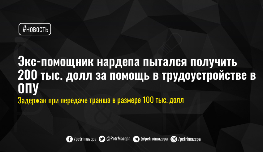 Экс-помощник нардепа пытался получить 200 тыс. долл за помощь в трудоустройстве в ОПУ