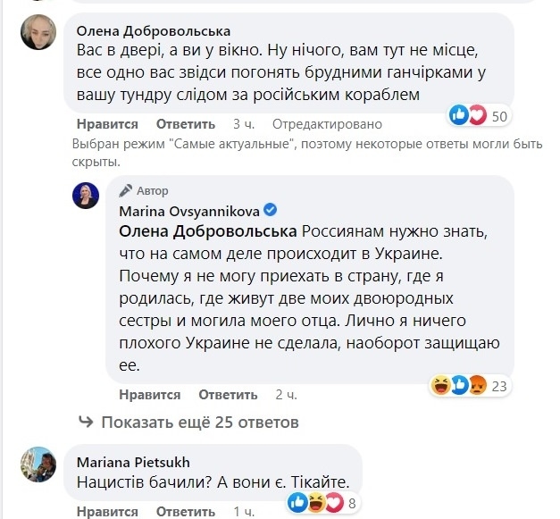 Российская пропагандистка Марина Овсянникова все же приехала в Украину и посетила Одессу. О жизни в которой решила сообщить своим подписчикам на Facebook. Позднее она удалила из общего доступа публикацию, возможно из-за того, что ее попытки представить себя «техническим сотрудником международного отдела», а не пропагандистской, разбились о сравнения такого описания с «честным и порядочным охранником в концлагере».
