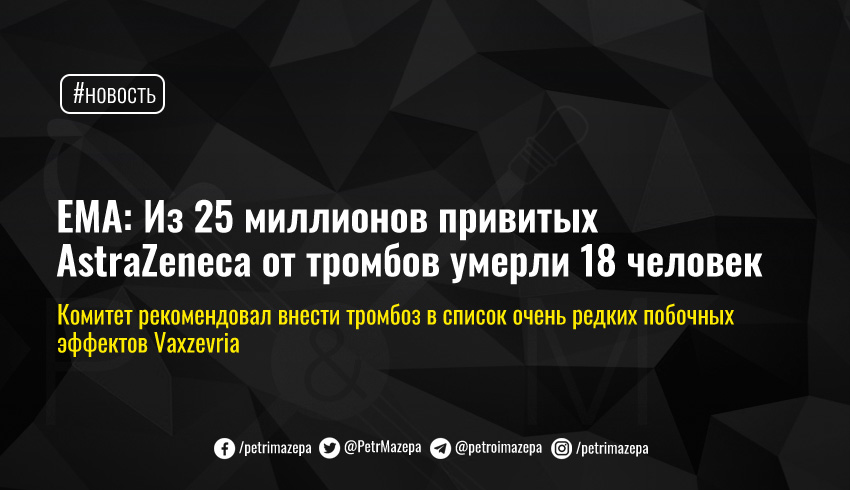 Комитет по безопасности Европейского агентства по лекарственным средствам (EMA) сообщил, что риск возникновения тромбов должен быть внесен в список очень редких побочных эффектов вакцины от AstraZeneca Vaxzevria. Отдельно подчеркивается, что подтверждено 18 летальных случаев от тромбозов на 25 млн привитых данной вакциной. Также опубликованы рекомендации, которые позволят вовремя начать лечить возможное осложнение, чтобы свести риск летального исхода до минимума.