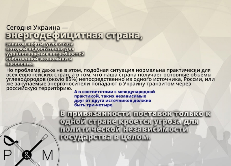 Сегодня Украина — энергодефицитная страна, запасов нефти, угля и газа которой недостаточно для удовлетворения потребностей собственной экономики и населения. Но проблема даже не в этом, подобная ситуация нормальна практически для всех европейских стран, а в том, что наша страна получает основные объёмы углеводородов (около 85%) непосредственно из одного источника, России, или же закупаемые энергоносители попадают в Украину транзитом через российскую территорию. А в соответствии с международной практикой, таких независимых друг от друга источников должно быть три-четыре. В привязанности поставок только к одной стране кроется угроза для политической независимости государства в целом.