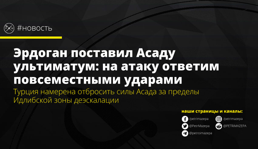 Президент Турции Реджеп Тайип Эрдоган выдвинул ультиматум Башару Асаду - он обещает ответить повсеместными ударами на любой ущерб, нанесенный турецким войскам, и заявляет о намерении отбросить силы Асада за пределы Идлибской зоны деэскалации.
