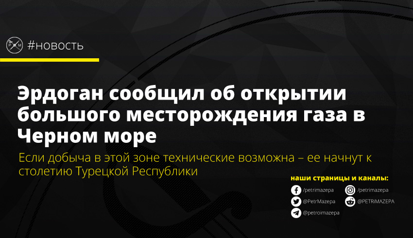 Президент Турции Реджеп Тайип Эрдоган 21 августа объявил об обнаружении крупных запасов природного газа у побережья Черного моря. По данным Reuters, запасов должно хватить Турции на лет потребления. А начало добычи запланировано на 2023 год – к столетию основания Турецкой Республики.