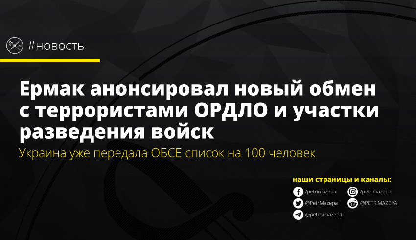 Глава ОПУ сообщил, что украинская сторона уже передала ОБСЕ список из 100 человек. «Надеюсь, что это произойдет в ближайшее время. Я думаю, что через несколько недель», - прокомментировал Ермак ситуацию с обменом Reuters. Второй стороной в этот раз снова буду контролируемые РФ террористы ОРДЛО. Они тоже уже подали списки в ОБСЕ, по данным Ермака.