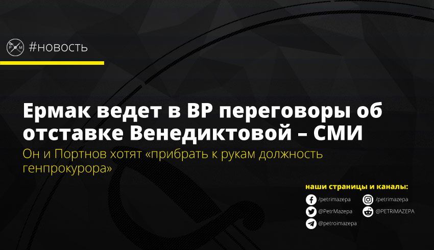 Глава Офиса президента Андрей Ермак проводит в Верховной Раде переговоры по поводу отставки генерального прокурора Ирины Венедиктовой, сообщает «Цензор.НЕТ». По их данным, должность генерального прокурора хотят «прибрать к рукам» не только Андрей Ермак, но и Андрей Портнов, который уже смог пролоббировать назначение своих людей в ОПУ и ГБР.