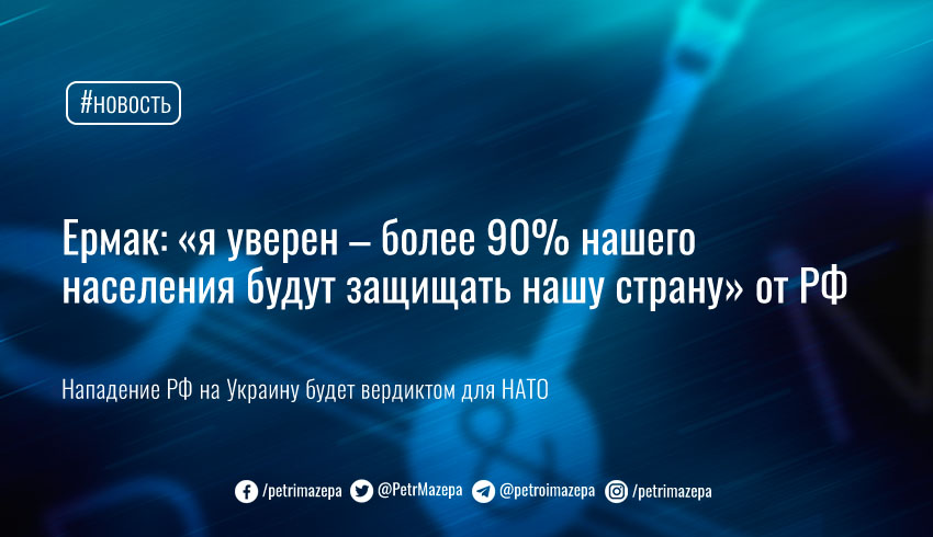 Ермак: «я уверен – более 90% нашего населения будут защищать нашу страну» от РФ
