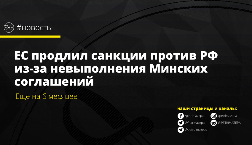 Страны Евросоюза договорились о продлении санкций против России, которые были введены в 2014 году. Данное решение должен официально утвердить Совет ЕС. Санкции против страны-агрессора были продлены из-за отсутствия прогресса в выполнении Минских соглашений.