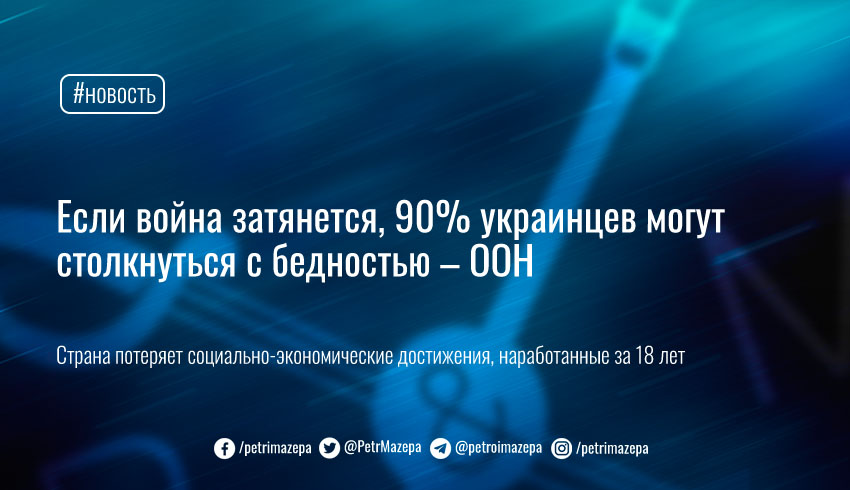 «Согласно предварительному прогнозу, опубликованному сегодня Программой развития Организации Объединенных Наций (ПРООН), если война в Украине затянется, то страна может потерять социально-экономические достижения, наработанные за 18 лет, при этом почти треть населения будет жить за чертой бедности, а еще 62% предстанут перед высоким риском обнищания в течение следующих 12 месяцев», - сообщается в пресс-релизе Программы развития ООН, цитирует «УНИАН».